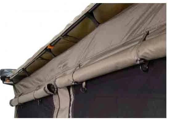 - 210 denier mould treated rip-stop polyester oxford material provides durability, and reduces the weight placed on the awning rafter arms and legs when compared to heavier poly cotton canvas options.