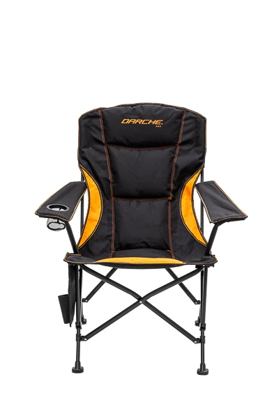 Dual layered King size folding camp chair Padded seat and backrest for extra support and comfort Folds easy for storage & transport Rubber arm eyelets – enhances durability and minimises sliding Drink holder designed to fit an Aussie stubby holder Versatile side storage pockets Steel frame construction with wide base feet to prevent sinking Double layered and padded 600D Polyester fabric Zippered carry bag included Rated: 150kg static weight