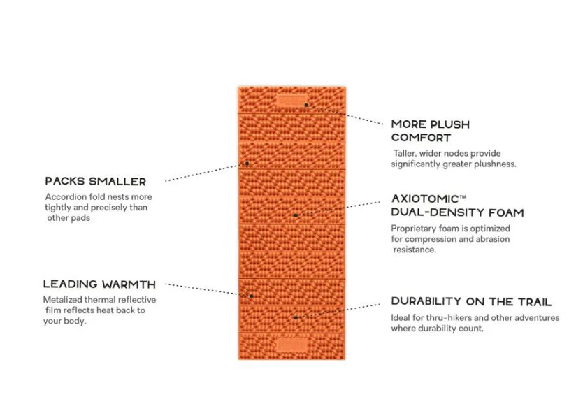 NEMO redefined the classic closed-cell foam sleeping mat to deliver more thickness and plush comfort in an industry-leading packed size. Nemo Switchback™ features hexagonal nodes, which are molded with our dual-density Axiotomic™ foam to create Hypnoelastic™ zones that conform to your body in a perfect balance of comfort and support. Switchback™ also leverages a metalized thermal film layer to efficiently reflect heat back to your body. Blend that with 15% more heat-trapping space, this new innovative design can deliver a warmer, more comfortable sleep than other pads in this category.
