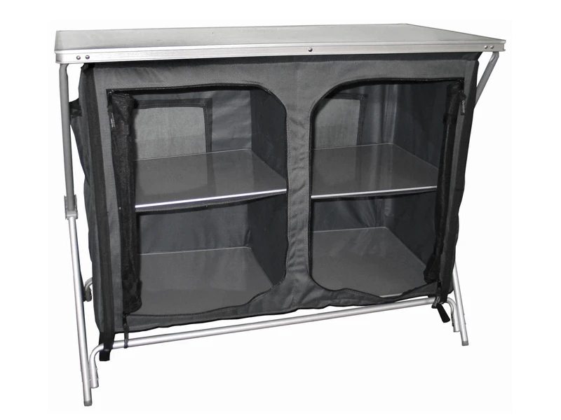 The design of the Quick-fold cupboard range allows for very quick erection. The aluminium frame simply folds out and the Velcro ties at the base secure it. Simply put the shelves and top plate in place and you are done. Quick and easy the Quick-fold range is ideal for camping.